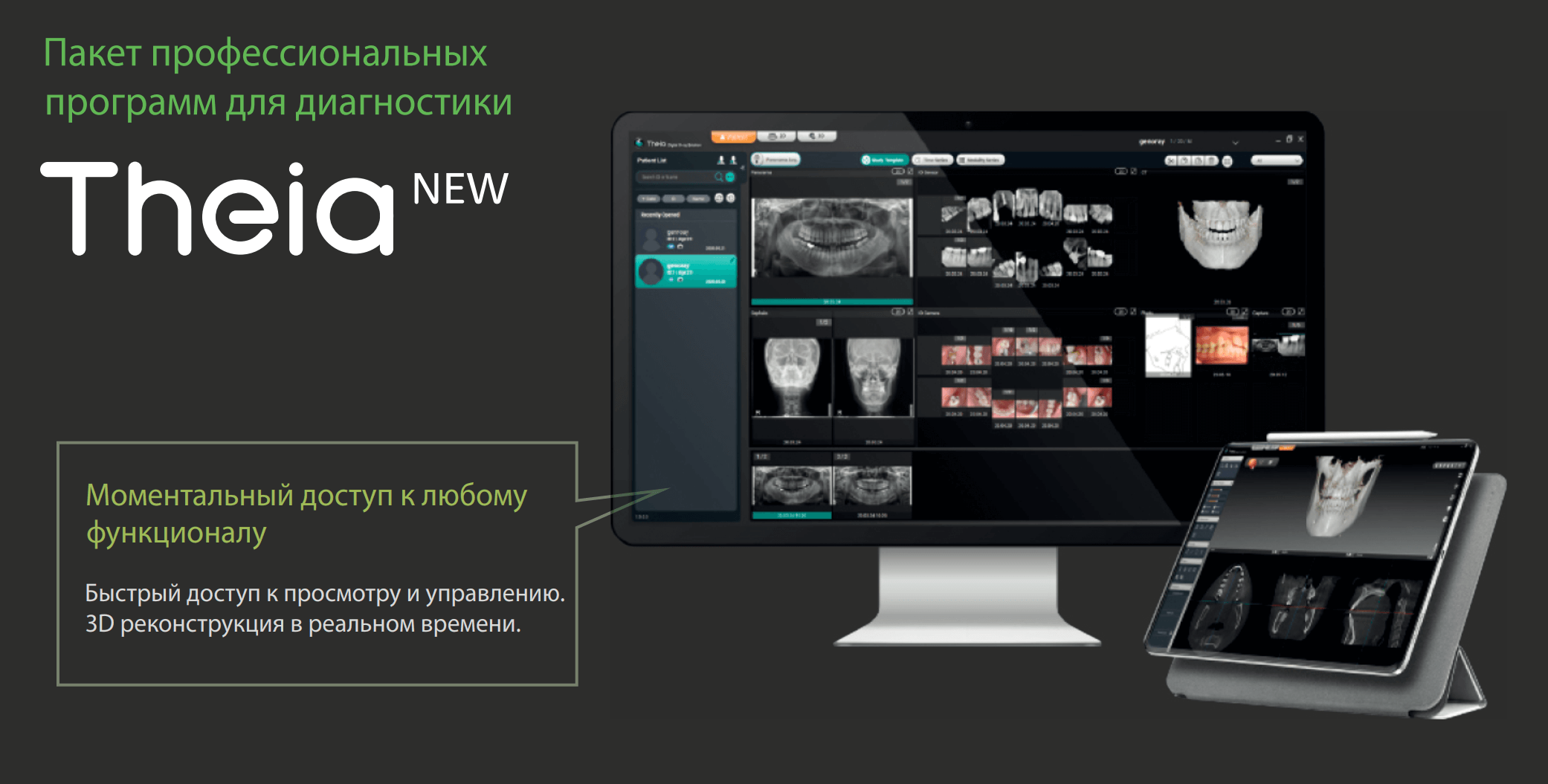 Пакет экспертных диагностических программ Theia NEW обеспечивает быстрый доступ к 3D реконструкции и просмотру, а также облегчает обработку, хранение и печать снимков.