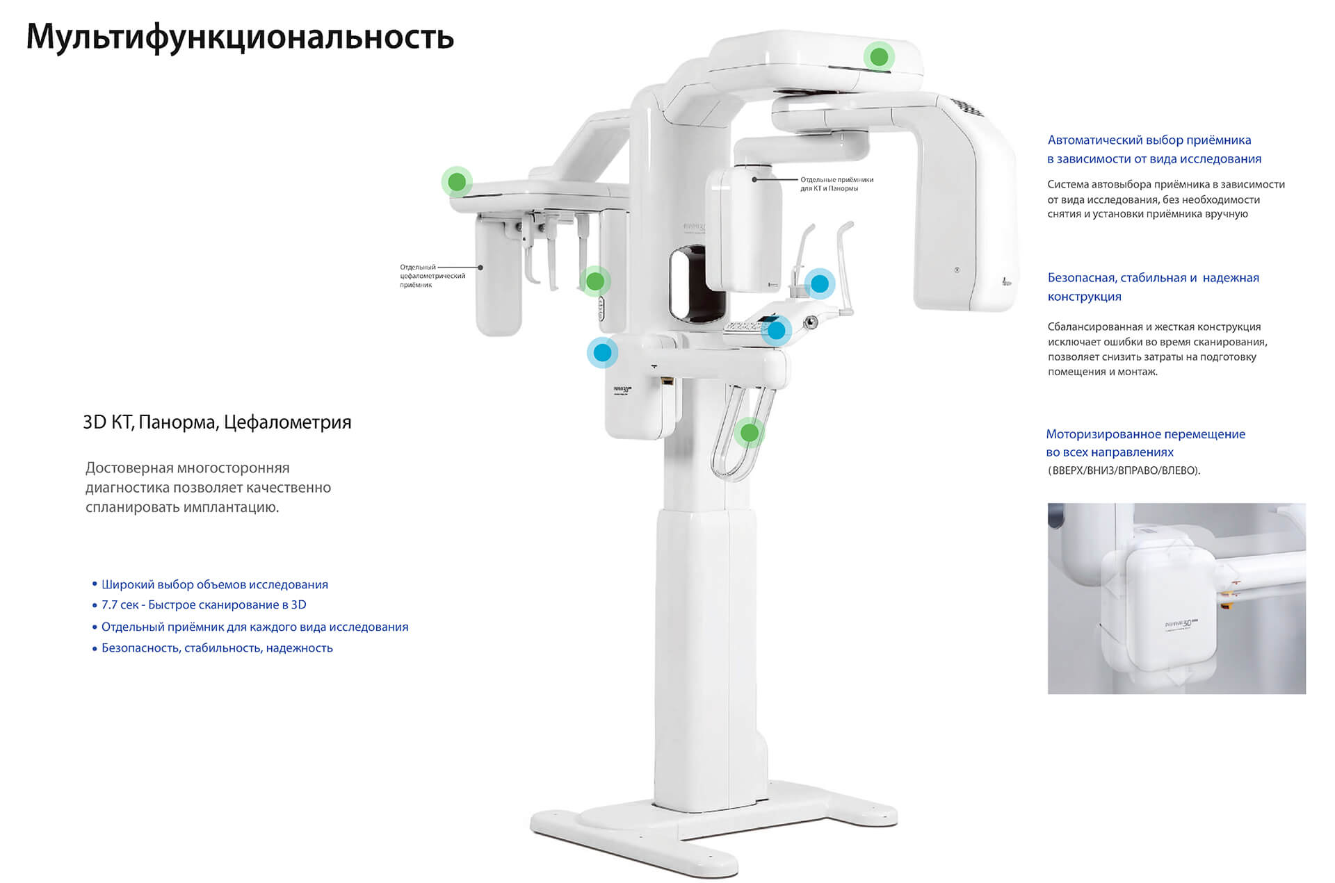 Сочетание линейного и вращательного движений, выполняемых одновременно, расширяют возможности диагностики. Большой спектр программ экспозиции позволяет выполнять любые виды панорамных снимков: