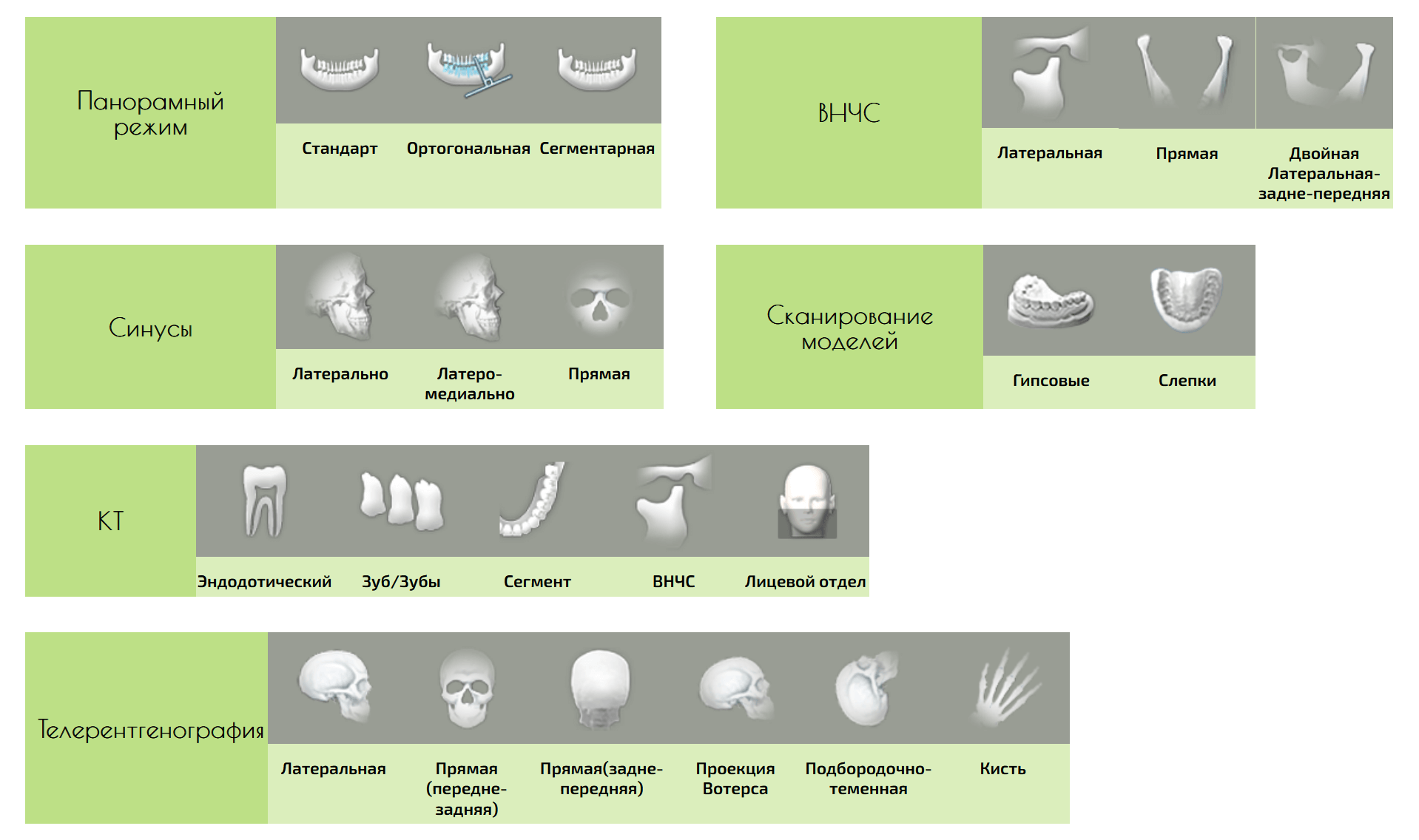 - Ортопантомография — панорамные 2D снимки зубочелюстной системы